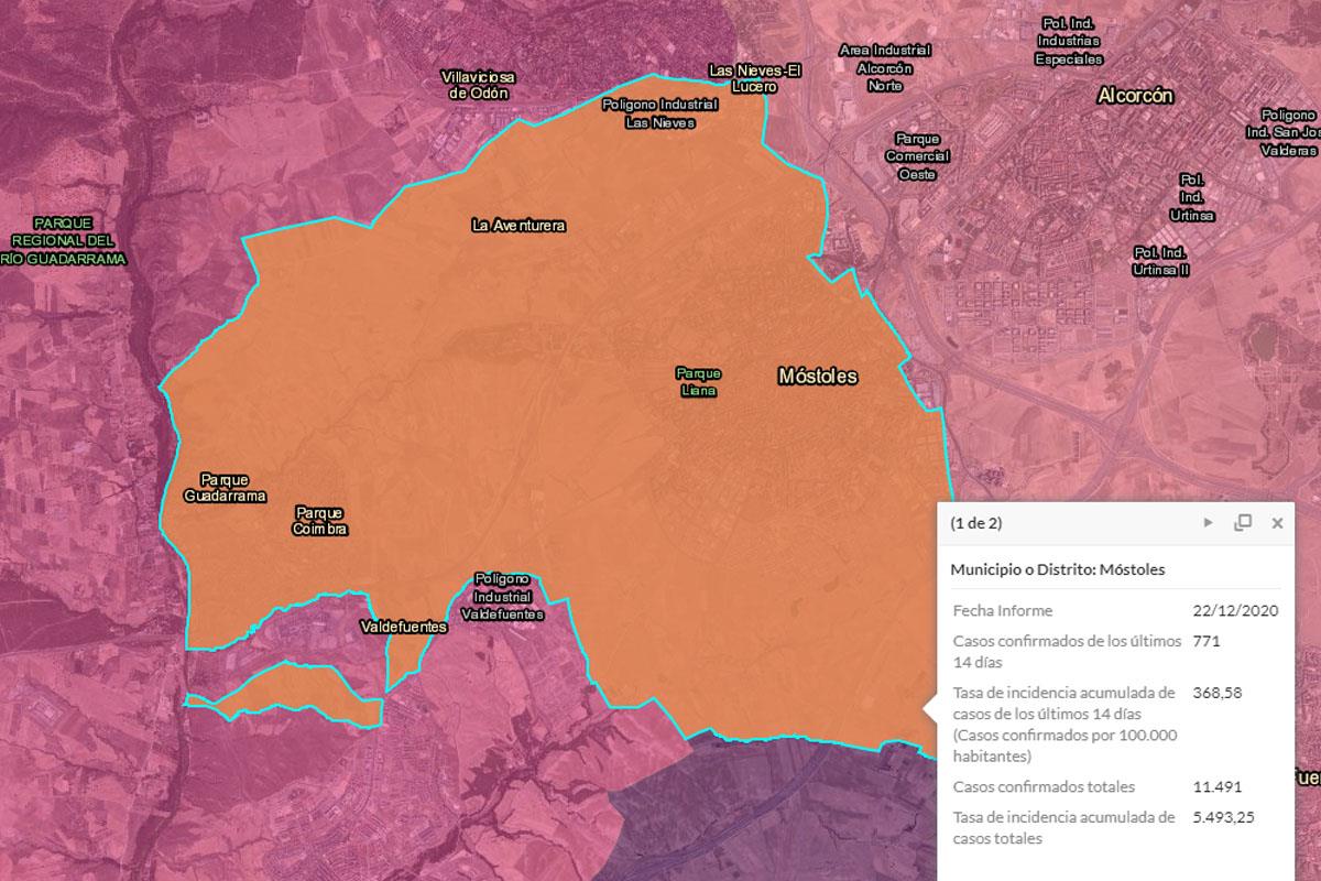 En el día de ayer, 22 de diciembre, se hizo público el nuevo informe de situación epidemiológica por municipios de la Comunidad de Madrid. Nuestro municipio de Móstoles suma ha dicha fecha 771 casos confirmados de covid-19 de los últimos 14 días.