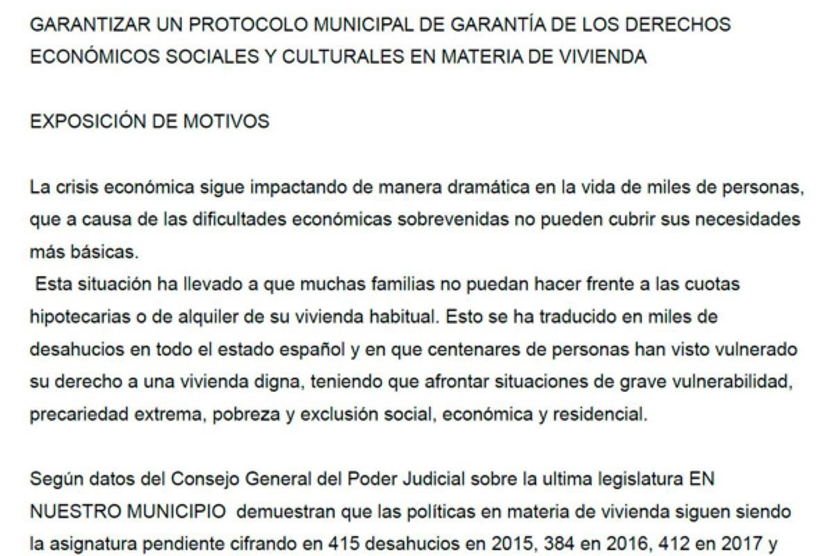 “Lo que exigimos con esta moción”, aclaran, “es que se cumpla con el Derecho Internacional y, en concreto, con las resoluciones del Comité de Derechos Económicos Sociales y Culturales de Naciones Unidas en materia de vivienda".