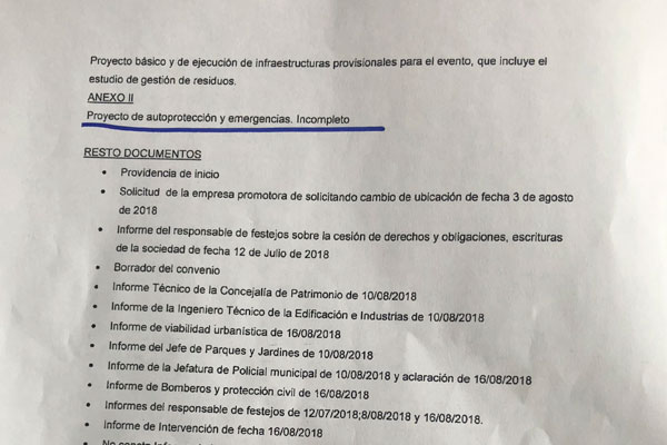 Las aparentes “irregularidades” han dejado a Gabriel Ortega “perplejo y asustado”. “¿Cómo puede ser que se autorice el evento sin estar completo el informe de autoprotección y emergencias?”, se pregunta el edil que recuerda que este parque cuenta con “pasarelas de más de 15 metros e importantes desniveles” que podrían poner en riesgo la seguridad del evento. Tampoco consta un estudio acústico pese a que es obligatorio por la Ley del Ruido y hay viviendas próximas a la nueva ubicación del evento.