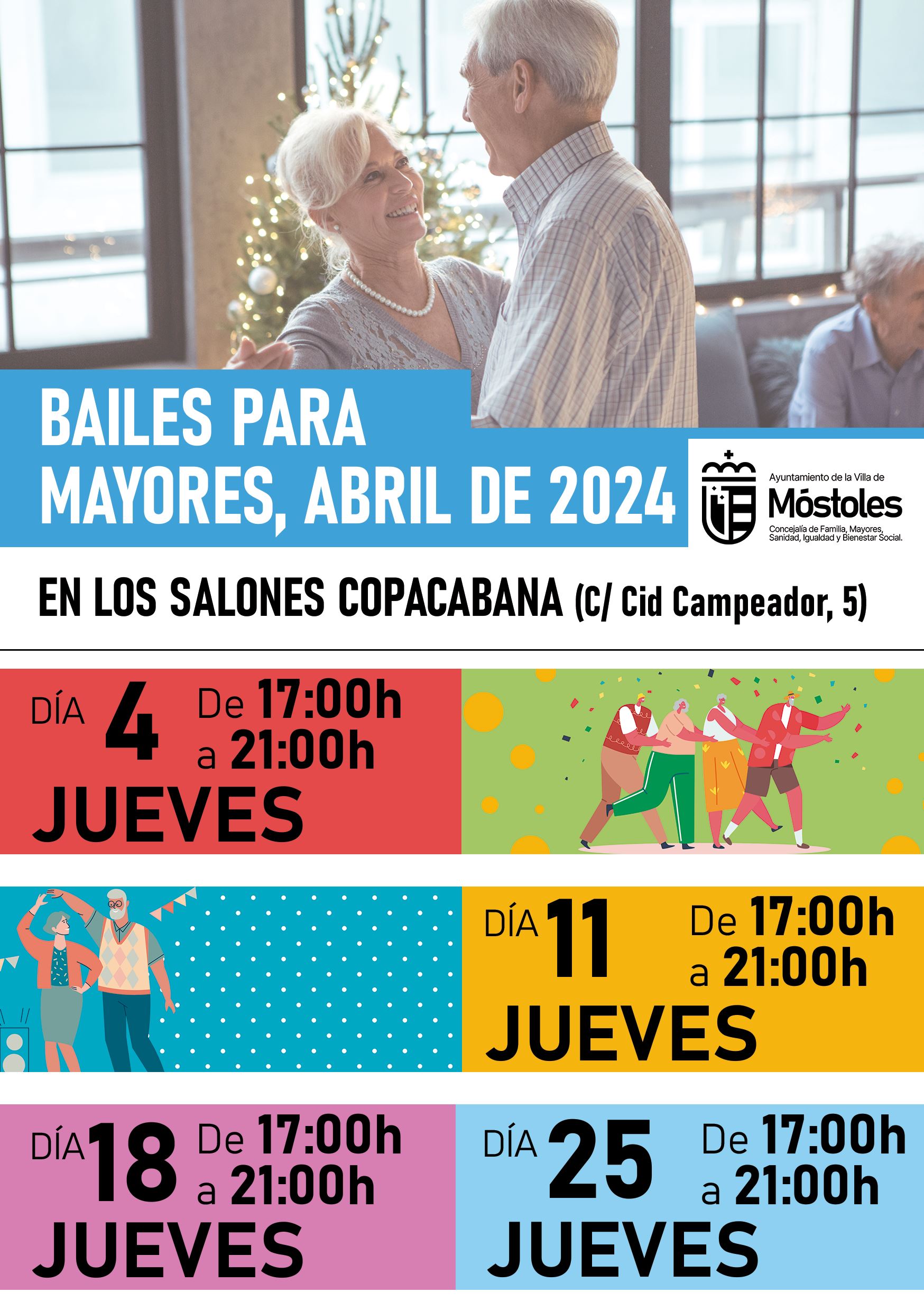 Las jornadas de baile tendrán lugar todos los jueves del mes (4, 11, 18 y 25), de 17:00 h a 21:00 h, en los salones Copacabana, ubicados en la calle Cid Campeador, 5. El recinto dispone de un servicio de parking gratuito para mayor comodidad y accesibilidad de los asistentes.