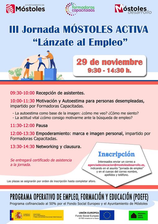 Si te encuentras en búsqueda activa de trabajo, piensas en abrir tu propio negocio o quieres adquirir nuevas herramientas para mejorar tu empleabilidad, asistir a las próximas jornadas "Lánzate al empleo" y "Móstoles Emprende" puede ayudarte en el proceso. La primera de ellas, que celebra su tercera edición de Móstoles Activa el día 29, estará impartida por Formadoras Capacitadas, y ofrecerá recursos de motivación y autoestima para personas desempleadas (en horario de 10 a 11.30) , además de nociones acerca del empoderamiento, marca e imagen personal (de 12 a 13.30).