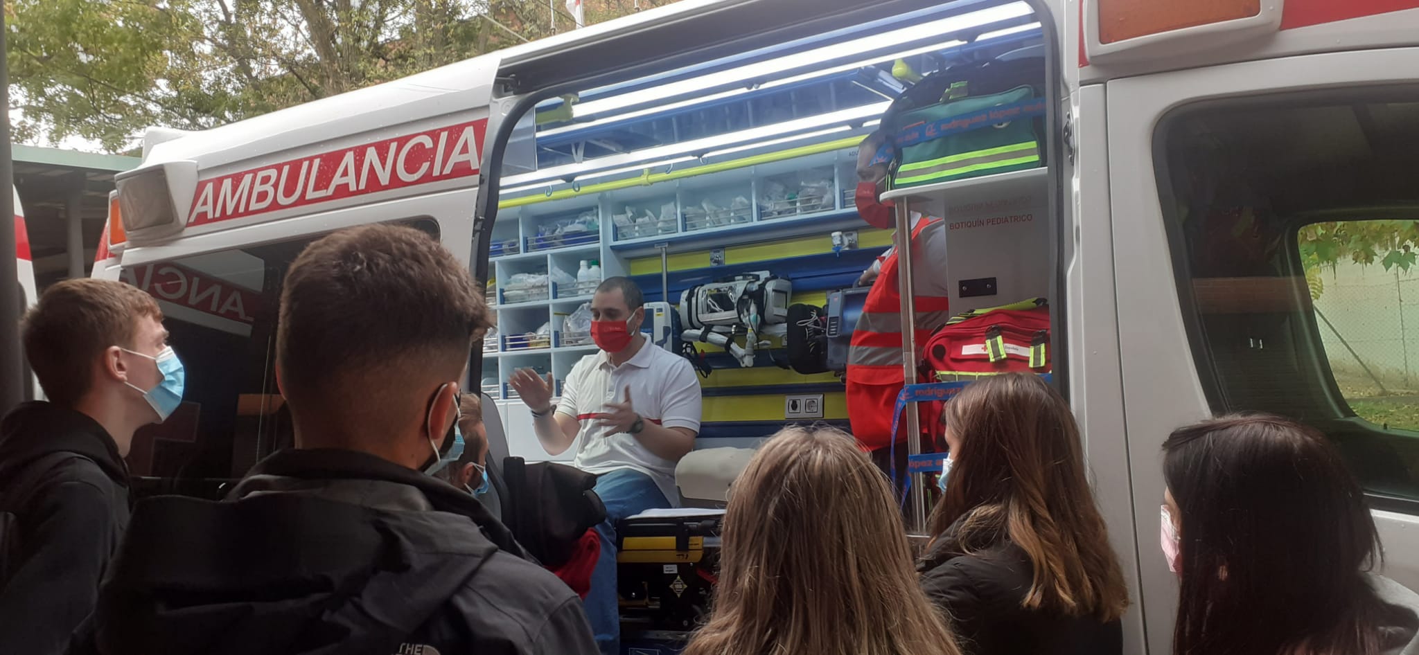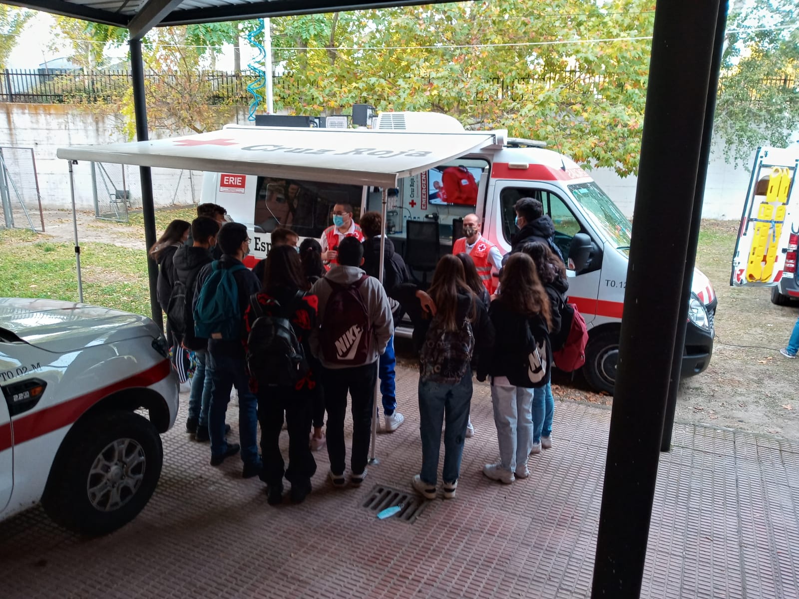 La mañana del pasado viernes, 29 de octubre, coincidiendo con el Día del Técnico de Emergencias Sanitarias, Cruz Roja Móstoles trasladó a las instalaciones del I.E.S. Benjamín Rúa, de la localidad cuatro vehículos de emergencia para que 60 alumnos del primer curso de Grado Medio de Técnico de Emergencias Sanitarias pudieran verlos in situ y, lo que es más importante, que recibieran las explicaciones de forma directa de los voluntarios que realizan los servicios de emergencia de la institución. Les contaron también algunas anécdotas y aclararon las curiosidades surgidas de las personas asistentes. Asimismo, se realizaron algunas demostraciones prácticas, en las que pudo participar el alumnado.