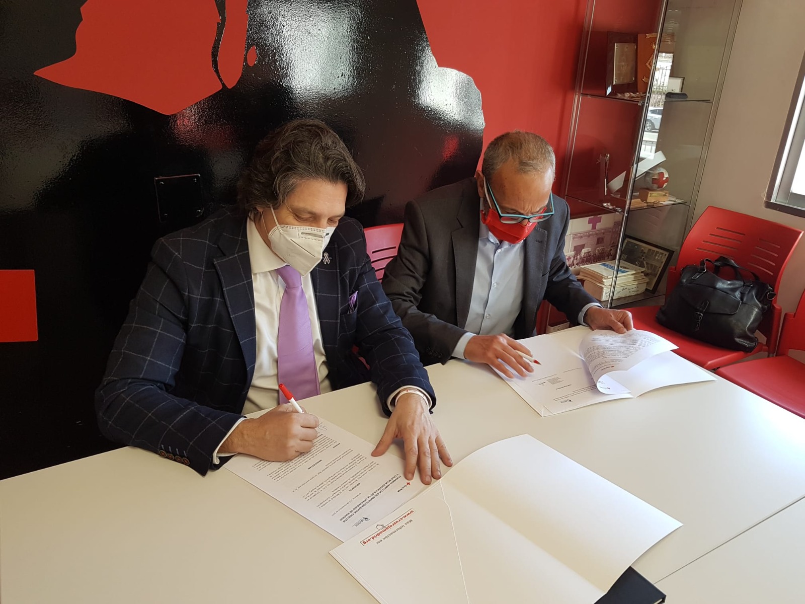 El acto de firma se realizó en las instalaciones de Cruz Roja; asistieron Pilar Ruiz, presidenta ACCGG, Lorenzo Pérez, presidente de Fidelitis, Salvador Parral y David Navalón, presidente y director técnico, respectivamente, de Cruz Roja Móstoles.