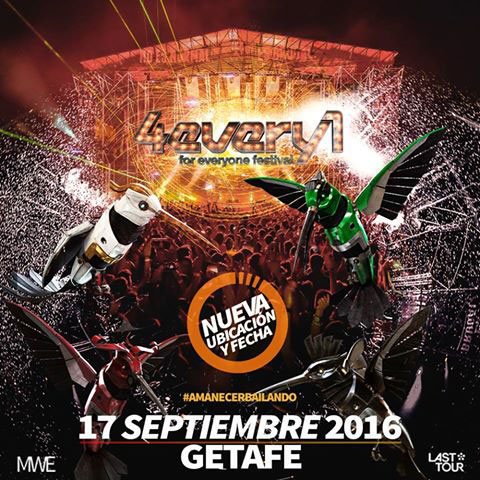El festival de música electrónica 4Every1 ha anunciado, desde su propia página web y redes sociales, que esta tercera edición no se va a celebrar en Móstoles. Desde hace unos días, hemos podido conocer que la nueva ubicación y la fecha de este macrofestival será el 17 de septiembre en el municipio de Getafe. Todavía no se ha publicado cuál será el recinto que acogerá la celebración de este festival ni la lista de artistas que se dejará la piel en el escenario el próximo septiembre. En estos momentos, la organización del festival está trasladando las actuaciones con los artistas que ya había anunciado a la nueva fecha y sustituyendo a todos los que no puedan confirmar su presencia por artistas de igual importancia.