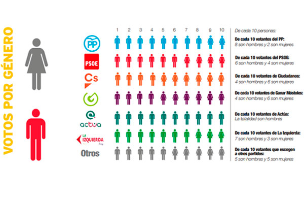 El estudio elaborado por Soyde Móstoles.com disecciona el perfil del votante por partido y sexo. En el caso del Partido Popular, la mayoría de los encuestados que han reconocido que confiarán en los populares son eminentemente hombres, concretamente 8 de cada 10. Un resultado similar registra la plataforma de La izquierda donde solo 3 de sus votantes son mujeres. Los partidos que más se acercan a la paridad son Ciudadanos que, de cada 10 votantes, 4 son hombres y 6 son mujeres. Un resultado idéntico que comparte con Ganar Móstoles (4 hombres y 6 mujeres). En el caso del PSOE, de cada 10 encuestados, 6 son hombres y 4 son mujeres.