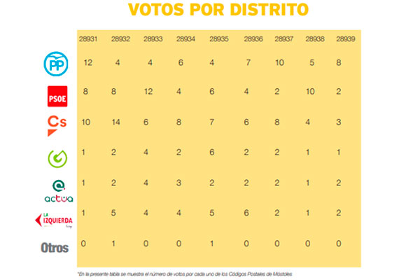 En contraposición los que se corresponde con el CP 28932, 28933 y el 28935, son los menos afines a los populares. Para el PSOE las zonas que abarcan los Códigos Postales 2933 y 2938 representan el nicho de voto de los socialistas mostoleños. El área representada por el CP 28937 es, sin embargo, la que menos simpatizantes acumula.