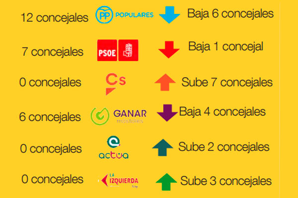 Mientras IU CM-Los Verdes, ya extinta, se reconvertiría en La Izquierda y Actúa, tanto PSOE como Ganar Móstoles perderían una parte importante de su representación.