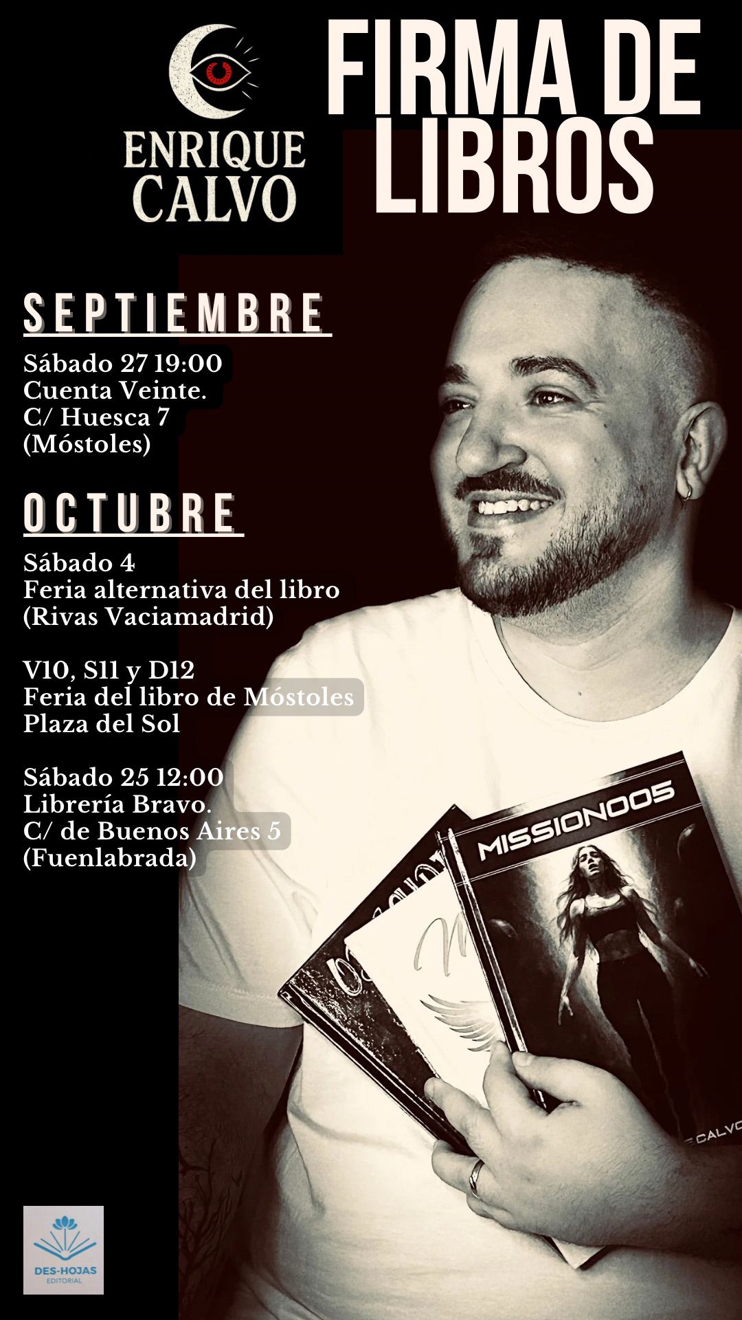 El escritor Enrique Calvo estará presente en la Feria del Libro de Móstoles para firmar ejemplares de MISSION005, título que se ha mantenido durante ocho semanas consecutivas entre los más vendidos de Amazon. Su ruta literaria pasará también por diversos enclaves de la ciudad y municipios cercanos.