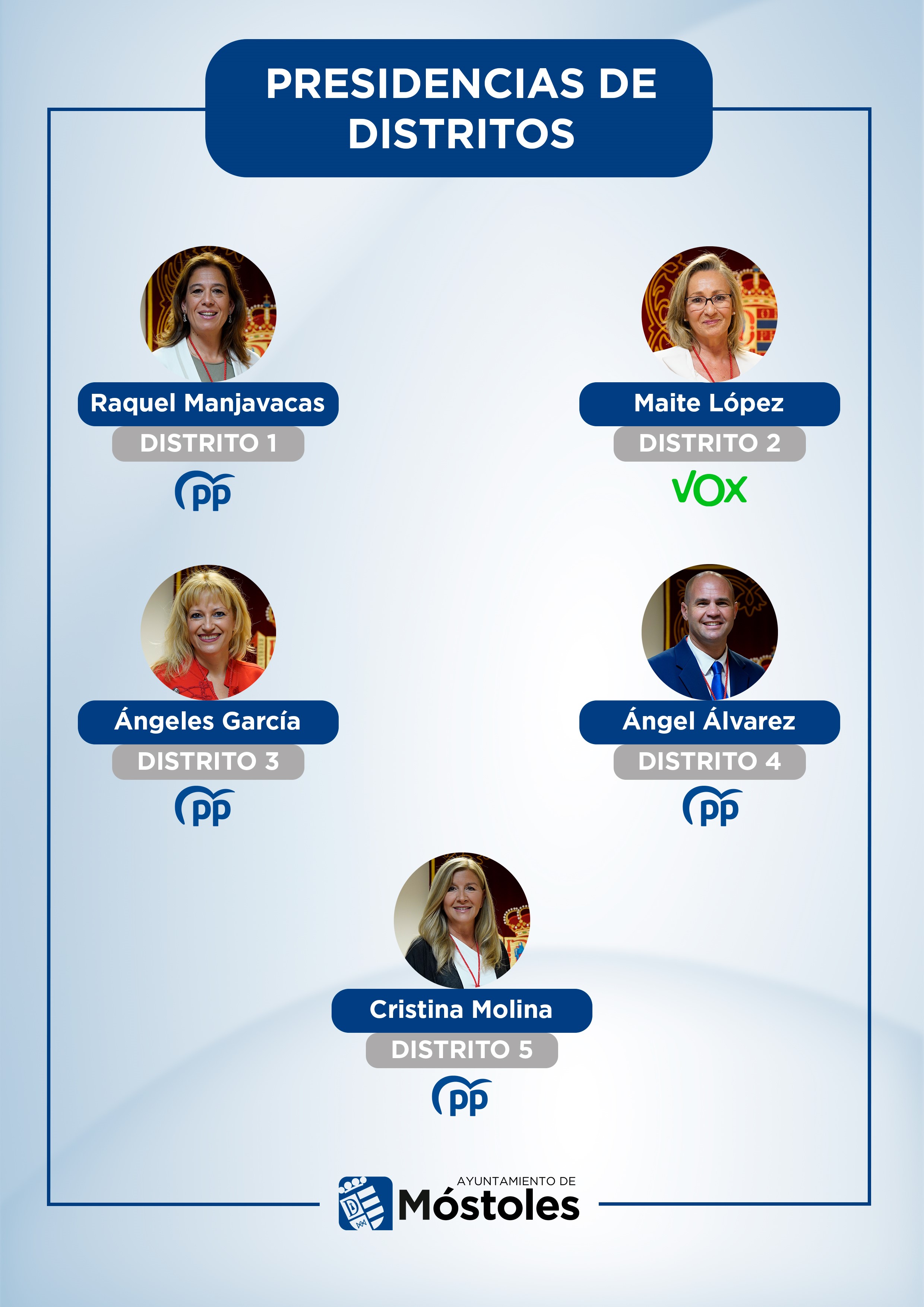 La Junta de Distrito Centro (nº 1) estará presidida por la Concejala de Familia, Mayores, Sanidad, Igualdad y Bienestar Social, Raquel Manjavacas; la Junta de Distrito Norte-Universidad (nº 2), por la Concejala Maite López; la Junta de Distrito Sur-Este (nº 3), por la Concejala de Economía, Industria y Empleo, Ángeles García; la Junta de Distrito Oeste (nº 4), el Concejal de Deportes, Ángel Álvarez; y la Junta de Distrito Coimbra-Guadarrama, por la Concejala de Educación y Festejos, Cristina Molina.