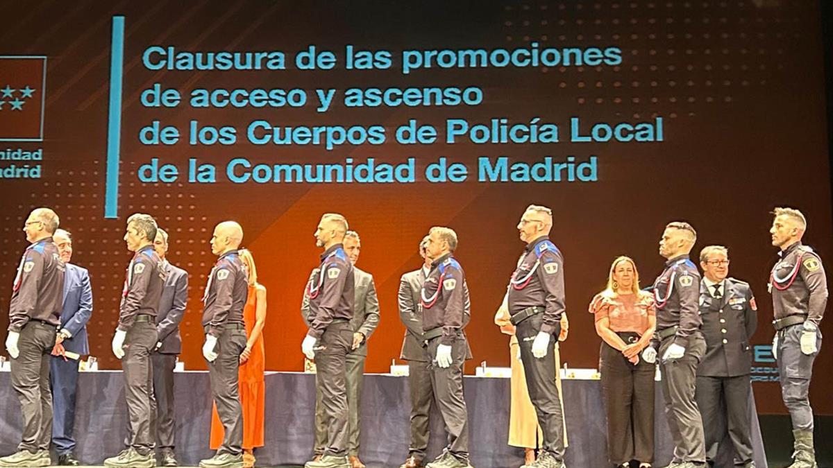 El concejal de Seguridad, Emergencias, Movilidad y Medio Ambiente, Gabriel Monteserín, y el jefe de Policía Municipal, Juan Manuel Arribas, asistieron este jueves al acto de clausura de esta etapa formativa, evento que estuvo presidido por el consejero de Medio Ambiente, Agricultura e Interior, Carlos Novillo, y que se celebró en el Teatro Auditorio Ciudad de Alcobendas.