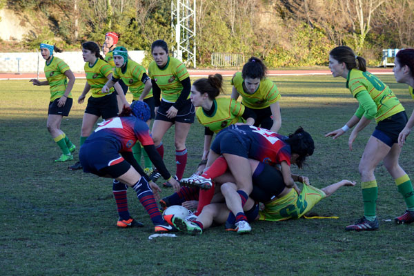 El partido comenzó con un saque de las locales, que acudieron al encuentro con la alineación justa y sin cambios. La primera posesión fue para las visitantes, aunque rápidamente se encontraron defendiendo dentro de su campo y varias veces dentro de veintidós, las envestidas de las majariegas. Jabatas no supo sacar su juego, no se encontraban cómodas en el campo, haciendo fases de ataque bastante desordenadas y perdiendo muchas veces la posesión por golpes de castigo o avants. En todo caso, al descanso se llegó con el marcador a cero.