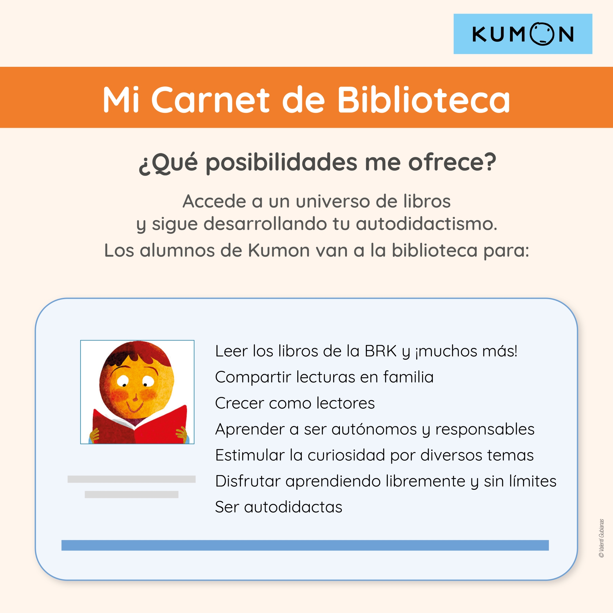 «Los beneficios de usar habitualmente la biblioteca son innumerables, pero para los alumnos de Kumon hay uno muy especial: La lectura es una actividad fundamental para incentivar el aprendizaje autodidacta», apunta Raquel Fernández, directora y orientadora de este centro que anima a las familias a implicarse en la educación lectora y el hábito de hacer uso de las bibliotecas de sus barrios; por ello, durante las próximas semanas, compartirá con sus alumnos y familias información y consejos para acercarse a la biblioteca de su barrio y hacerse socio, porque: