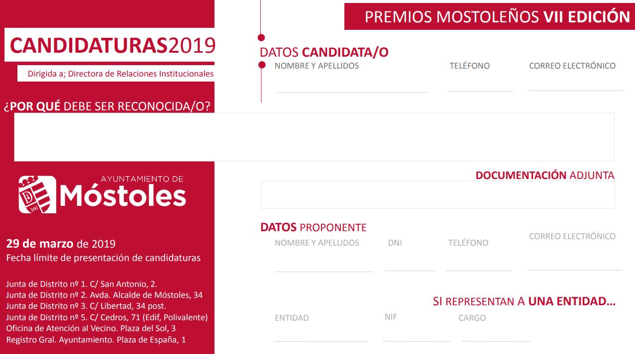 Las candidaturas se pueden presentar, hasta el 29 de marzo, en el Registro General, los Registros de los Distritos o la Oficina de Atención al Vecino del Ayuntamiento de Móstoles, mediante el modelo oficial y explicando los motivos por los que se presenta.