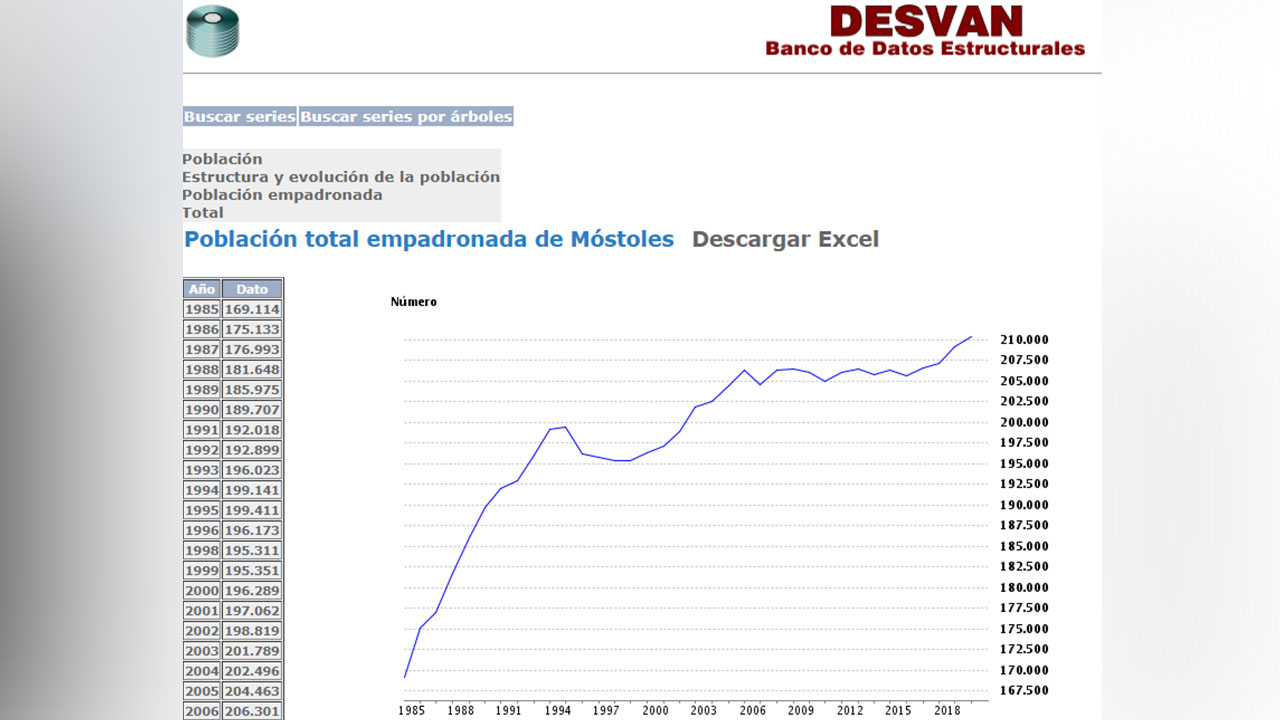 También, y en último lugar, si echamos un vistazo al Banco de Datos Municipal "Almudena" de la Comunidad de Madrid, con datos desde 1985 a 2020, vemos que la población mostoleña era inferior en 1985 frente a 1996, con 169.114 habitantes el primer año, y 196.173 el segundo. En este periodo, hay que destacar los hitos de población de 1986 (Se superaron conjuntamente los 170.000 y los 175.000 habitantes, quedando la cifra en 175.133 vecinos), 1988 (Se superaron los 180.000 habitantes, con 181.648 vecinos), 1989 (Se superaron los 185.000 habitantes, con 185.975 vecinos), 1991 (Se superaron los 190.000 habitantes, con 192.018 vecinos) y 1993 (Se superaron los 195.000 habitantes, con 196.023 vecinos), llegando la población en el año 1995 a rozar los 200.000 habitantes, con 199.411 vecinos. Pero llegados a este punto, tenemos que alargar el periodo de "Pérdida periódica" registrado tras cambiar el sistema de medición del INE desde el año 1995, puesto que baja en los años siguientes, quedándose en 1998 en los 195.311 vecinos descritos anteriormente, y no registrando un aumento de la población inicial hasta 2003 (9 años después), cuando alcanza los 201.789 vecinos. Esto supone una pérdida total de 4.100 vecinos, la mayor pérdida con datos de las décadas recientes. A simple vista, se observa que el mayor descenso de población se produjo entre 1995 y 1996, con una pérdida de 3.238 habitantes (De 199.411 vecinos a 196.173). Pero por el lado de los aumentos, tenemos un aumento de 6.019 habitantes entre 1985 y 1986, pasando de 169.114 vecinos a 175.133. Finalmente, hay que indicar que la fase de mayor aumento de la población de Móstoles es anterior a la creación de la Comunidad de Madrid, siendo demostrable en la década de 1970, pero para no extenderse más, no vamos a entrar en ella en esta noticia.