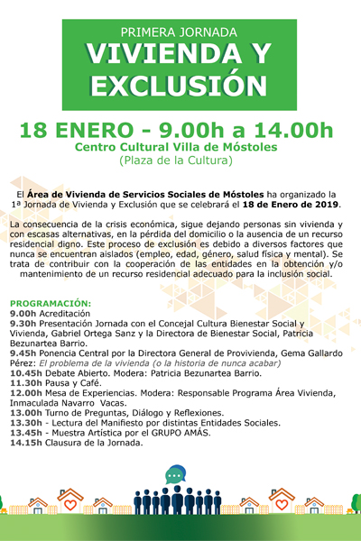 Bajo el título Jornada de Vivienda y Exclusión Social, organizado por el Área de Vivienda y Servicios Sociales de Móstoles, esta sería la primera jornada que será presidida por el concejal de Cultura, Bienestar Social y Vivienda, Gabriel Ortega, la directora de Bienestar Social de Móstoles, Patricia Benzuartea, y varias Entidades Sociales que trabajan en el municipio como CEAR, Cruz Roja, Provivienda, Punto Omega, Rais Fundación, la Oficina de Derecho a la Vivienda Municipal y el Instituto Municipal de Suelo.