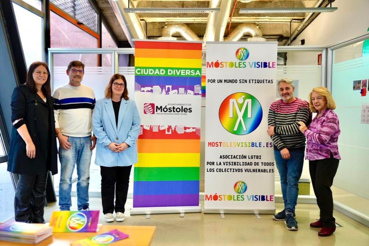 La alcaldesa, Noelia Posse, acompañada de la concejala de Igualdad, Lola Triviño y la concejala de Empleo y Nuevas Tecnologías, Rebeca Prieto, han visitado este ‘Punto Arcoíris’ donde les han recibido José Manuel Espadas Molina, presidente de ‘Móstoles Visible’, e Isidro García Rey, secretario y tesorero de la asociación.