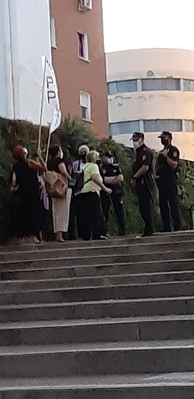 Desde el colectivo señalan como una contradicción que se les negara el acceso para desplegar dos pancartas cuando “en el recinto ferial, las terrazas de los bares y las colas para los espectáculos los controles eran bastante cuestionables”, y añaden que “se nos arrinconó en un lateral de las escaleras de acceso y se no obligó a abandonar los aledaños de la plaza con la excusa de las medidas de protección de la COVID19; entre tanto un ‘escogido’ grupo de personas sentadas y parapetadas con vallas opacas y Policía Municipal, jaleaban y aplaudían el acto” .