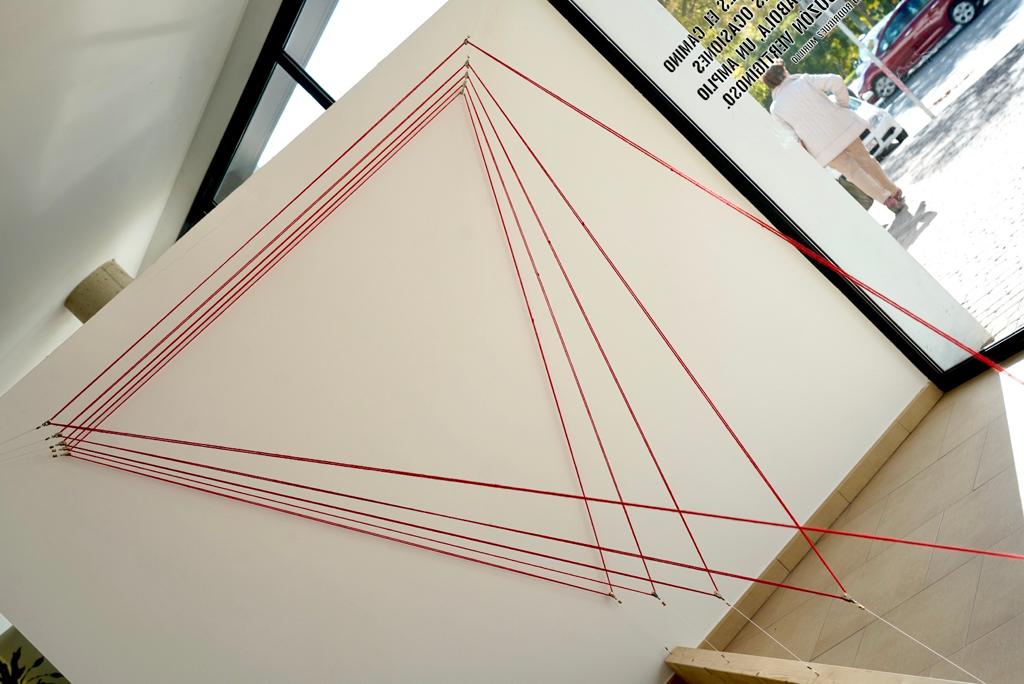 La intervención “Trigonometrías I” tiene unas dimensiones aproximadas de dos metros y medio de altura, por tres de anchura y cuatro de longitud. Cuando un artista introduce una obra de ese tamaño en un espacio expositivo, ésta acapara la atención del espectador de una forma inmediata e inevitable.