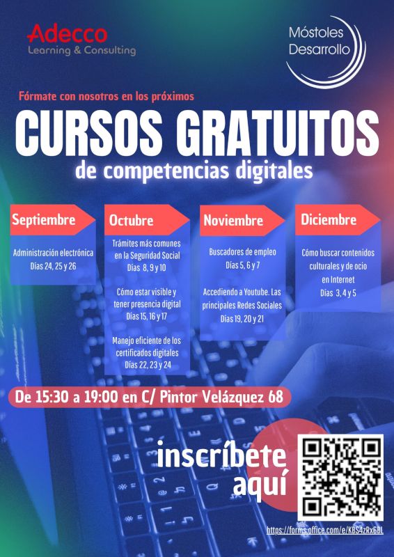 El Ayuntamiento de Móstoles, a través de Móstoles Desarrollo y Adecco han firmado un convenio de colaboración para impartir 7 talleres gratuitos de competencias digitales que se desarrollarán durante el próximo cuatrimestre. El objetivo de estos itinerarios formativos es acercar la tecnología a la población, reducir la brecha digital y facilitar el uso de herramientas digitales en el día a día de la ciudadanía de nuestra ciudad.