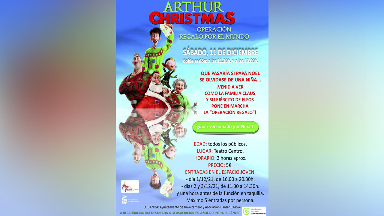 El Ayuntamiento de Navalcarnero ha anunciado a través de las Redes Sociales que volverá a realizar un espectáculo benéfico en la localidad, dentro de la programación de navidad. En esta ocasión, se trata de la obra de teatro titulada "Arthur Christmas: Operación Regalo por el Mundo". Dicha obra, con un guion versionado por Nina T., se representará en el Teatro Municipal Centro el próximo sábado día 11 de diciembre con dos pases disponibles: A las 11:30 horas y a las 19:00 horas. La obra, apta para todos los públicos, tiene una duración aproximada de 120 minutos.