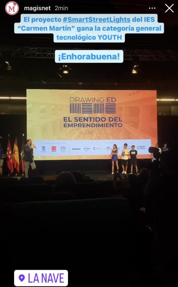 Elena del Prado, Nourdin El Boudkhani, Estela Maroto y Sergio Álvarez, alumnos de 3º B del Instituto Carmen Martín Gaite de Navalcarnero, se han proclamado vencedores del concurso Drawing ED “El sentido del emprendimiento”, en la categoría tecnológica Youth - la establecida para participantes de entre 14 y 17 años-, con su proyecto de tecnología ‘Smart Street Lights’.
