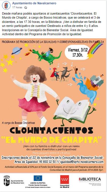 Se trata de una actividad enmarcada dentro del Programa de Promoción de la Igualdad y Corresponsabilidad en familia, cofinanciada al 50% por el Fondo Social Europeo, en el marco del Programa operativo de la Comunidad de Madrid para el periodo 2014-2020.