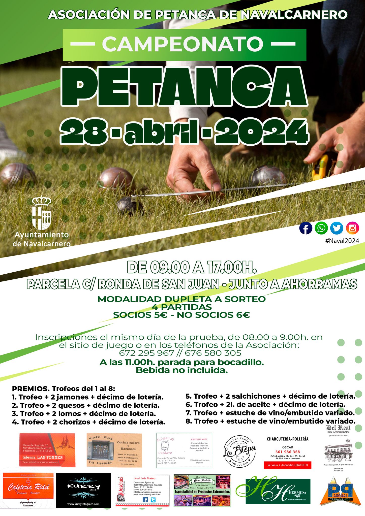 El Ayuntamiento de Navalcarnero y la Asociación de Petanca del municipio han organizado la tercera edición del campeonato de petanca de la localidad. Se celebrará el 28 de abril en la Parcela de la calle Ronda de San Juan (junto al Ahorramás), en horario de 9:00 a 17:00
