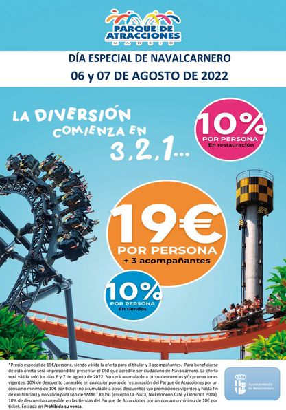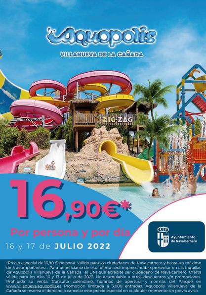 Los días 16 y 17 de julio podrás acceder a Aquópolis Villanueva de la Cañada comprando tu entrada en taquilla por solo 16,90€, acreditando que vives en Navalcarnero mediante la presentación del DNI, y los días 6 y 7 de agosto, para el Parque de Atracciones de Madrid, por 19€