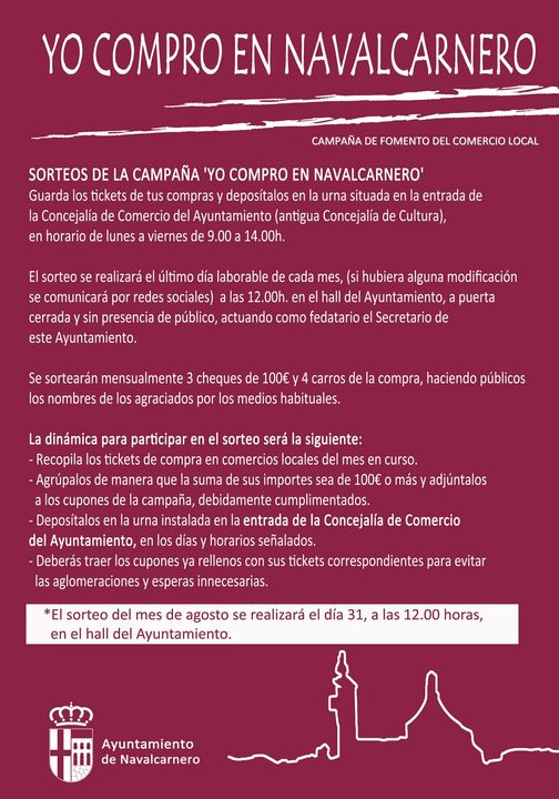 Los sorteos de la campaña 'Yo compro en Navalcarnero', desarrollada por la Concejalía de Comercio del Ayuntamiento, continúan su actividad este mes de agosto, en el que nuevamente podremos optar a uno de los tres cheques de 100 euros o uno de los cuatro carros de la compra disponibles, producto de merchandising del Consistorio. Para participar, hay que grapar tickets de compra en establecimientos de nuestra localidad, pertenecientes al mes en vigor, y que sumen al menos un gasto de 100 euros, al cupón de participación creado a tal efecto, disponible en la planta semisótano del Ayuntamiento, donde también está la urna donde depositarlos. El horario de apertura es de 9 a 14 horas, y el sorteo de este mes se realizará el 31 de agosto, a las 12.00 horas, en el hall de la Casa Consistorial.