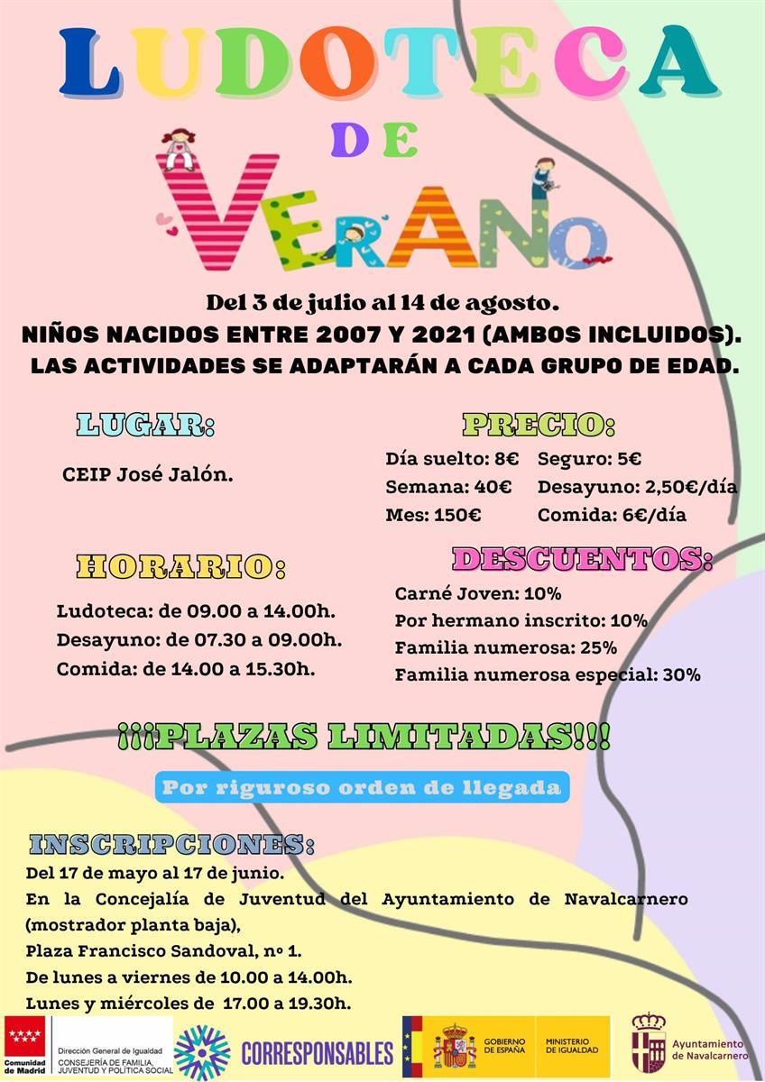 El Ayuntamiento de Navalcarnero ha anunciado la apertura de matriculación en la Ludoteca de Verano, que se ubicará en el CEIP José Jalón. La fecha de apertura se ha estipulado para el 17 de mayo con vista a acoger niños nacidos entre 2007 y 2021. Del mismo modo, las actividades se adaptarán a cada grupo de edad.