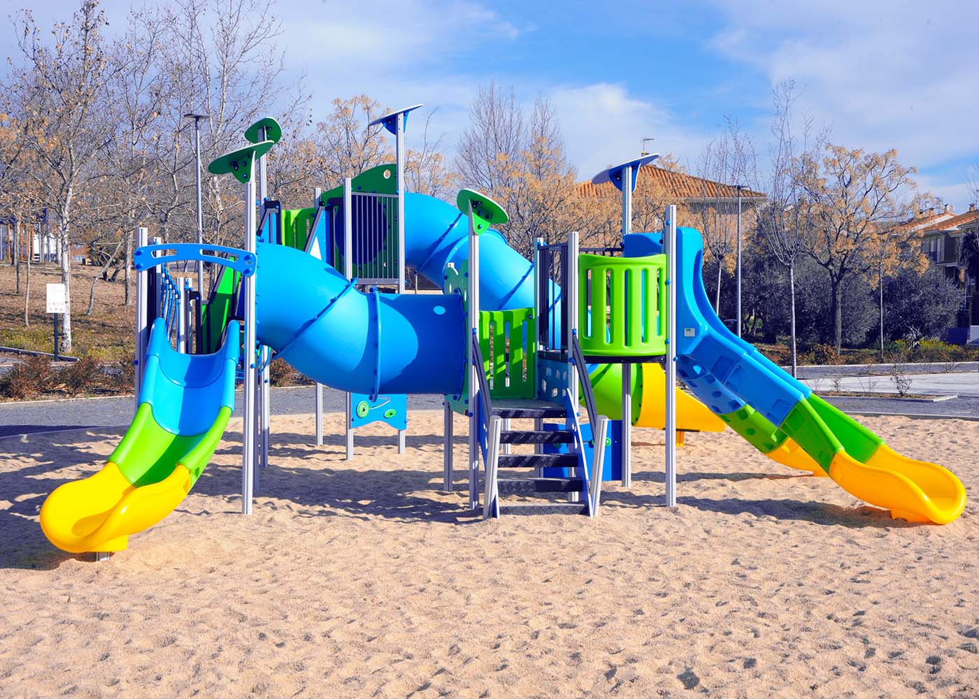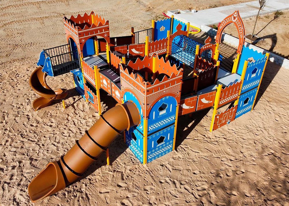 El parque de El Cid, por su parte, está diseñado con formas y toboganes de fantasía, con una llamativa composición cromática y propuestas que estimulan diversas habilidades motoras y sensoriales, con túneles, rincones y puentes, apostando por el elemento Alu6, el conjunto más completo de la gama, que garantiza una durabilidad extrema.