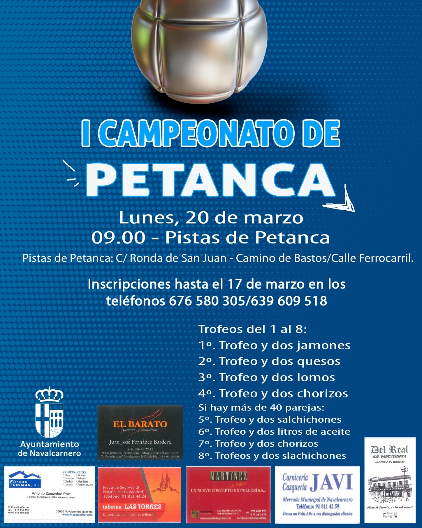 Navalcarnero se convertirá el próximo lunes 20 de marzo, en el epicentro de la petanca española. La localidad madrileña, organiza el primer Campeonato de Petanca. El lugar de celebración serán las pistas de la Calle Ronda de San Juan con Camino de Bastos.