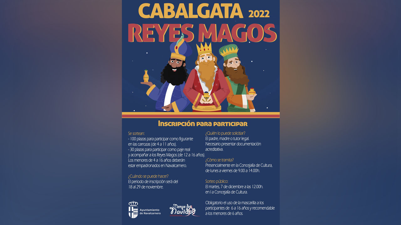 En la mañana del día de hoy, 18 de noviembre, el Ayuntamiento de Navalcarnero ha abierto las inscripciones para reclutar participantes de 4 a 16 años para que en enero de 2022 [Falta confirmar por parte del Ayuntamiento el día y hora exacta] se realice tras 24 meses una nueva edición de la Cabalgata de Reyes de Navalcarnero, siempre que las autoridades sanitarias delegadas para evitar la propagación de la COVID-19 no lo impidan por una alta transmisión de la enfermedad en ese momento. Concretamente, el número máximo de participantes en las carrozas municipales (No el número máximo de inscripciones posibles, que es ilimitado) es de 130 personas, siendo 100 plazas para niños de 4 a 11 años, que participarán como figurantes de carroza, y 30 plazas para adolescentes de 12 a 16 años, que participarán como pajes reales en las 3 carrozas de los Reyes (Melchor, Gaspar y Baltasar). La inscripción deberá ser realizada por los padres, madres o tutores (Presentando la documentación acreditativa de pertenencia del menor) en la Concejalía de Cultura, sita en la Plaza de Segovia Nº1, primera planta, en horario de 9:00 a 14:00 horas, hasta el próximo lunes 29 de noviembre. La hoja de inscripción (Habiendo una para menores de 14 años y otra para mayores de dicha edad) se encuentra disponible para su descarga en la Web Municipal. Todos los menores participantes en la Cabalgata deberán estar empadronados en Navalcarnero. Una vez cerrado el plazo de inscripción, el viernes 3 de diciembre saldrán publicadas las listas de inscritos totales en la Concejalía de Cultura para posibles subsanaciones.