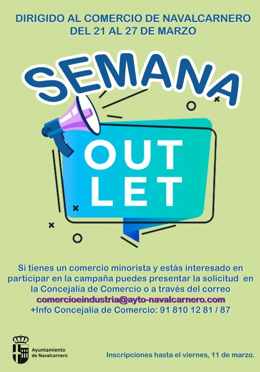 Si tienes un comercio y dispones de mercancía en stock de temporadas anteriores, la Concejalía de Comercio te propone participar en la Semana outlet del comercio de Navalcarnero, que tendrá lugar del 21 al 27 de marzo en los propios establecimientos participantes. Se trata de dedicar un pequeño espacio de la tienda a la liquidación de excedentes de mercancía a un precio promocional o con descuento inferior al habitual de venta al público.