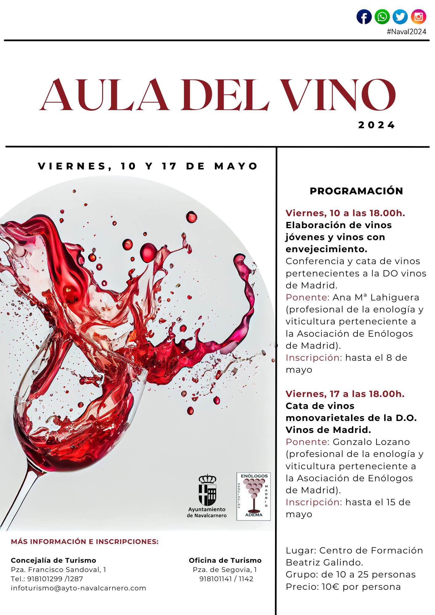 Durante el primer viernes habrá una conferencia impartida por la ponente Ana Mª Lahiguera, profesional de la enología y viticultura perteneciente a la Asociación de Enólogos de Madrid. También habrá una cata de vinos perteneciente a la D.O. vinos de Madrid. La jornada comenzará a las 18:00, y las inscripciones podrán realizarse hasta el 8 de mayo.