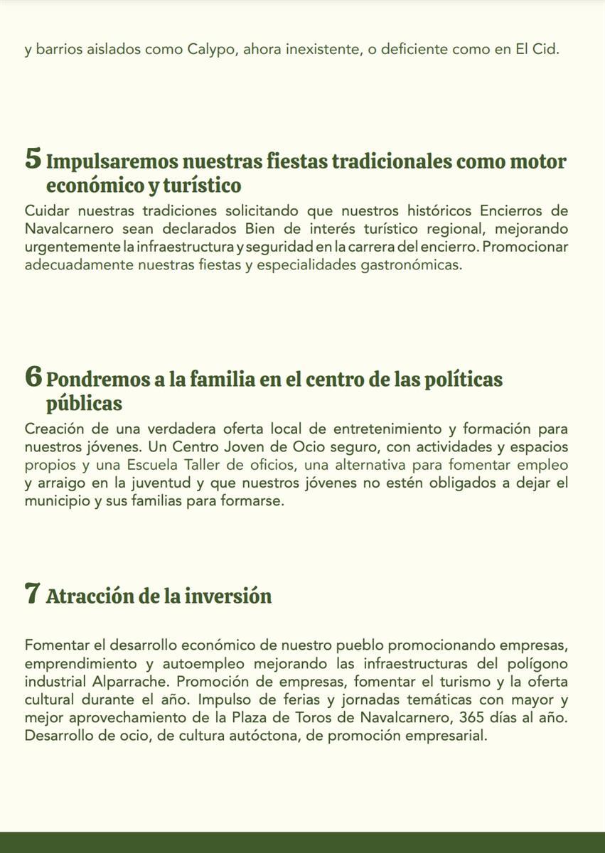 La cultura, del mismo modo, es un punto importante en su programa. Desde el partido, prometen cuidar las tradiciones de la localidad solicitando que los Encierros de Navalcarnero sean declarados Bien de Interés Turístico Regional. También, promocionarán adecuadamente las fiestas y las especialidades gastronómicas.