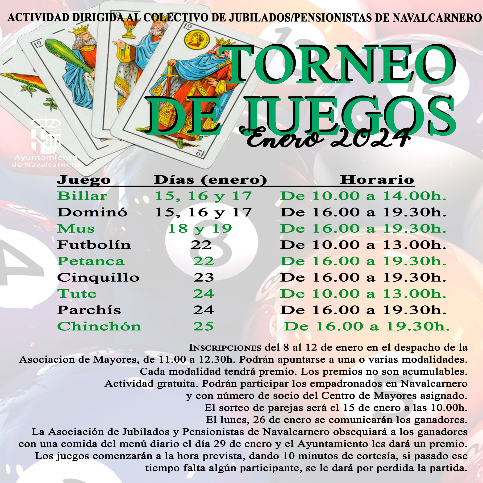 Las inscripciones, de carácter gratuito para empadronados en el municipio -y con número de socio asignado-, se podrán formalizar del 8 al 12 de enero en el Centro de la Tercera Edad, en horario de 10 a 12.30. Es posible apuntarse a una o varias modalidades, y el sorteo de parejas se celebrará el día 15 a las 10.
