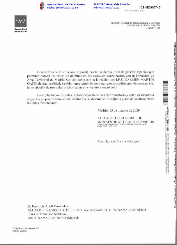 Vecinos por Navalcarnero exige la construcción de nuevos centros educativos en la localidad, petición que "se lleva solicitando desde hace más de una década, ante el crecimiento demográfico del municipio". En esta línea, hace referencia a que "el propio Consejo de Gobierno de la Comunidad de Madrid aprobó en su reunión de 27 de abril de 2022 la contratación de obras en infraestructuras de la educación pública regional por importe de 8,9 millones de euros para dar respuesta a las necesidades de escolarización de determinados municipios a partir del próximo año, de los que 1,5 millones de euros irían destinados a la reforma del colegio público María Martín, para aumentar en 12 el número de aulas de ESO, que darían servicio a 360 escolares".