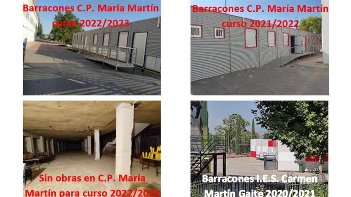 En esta línea, Vecinos por Navalcarnero lamenta que el uso de barracones, instalaciones que tenían un "carácter transitorio" en las notificaciones remitidas al Ayuntamiento, se haya extendido en el tiempo y continúe a día de hoy en dicho colegio: "para el próximo curso escolar 2022/2023 nos encontramos con que lo único que ha hecho el Gobierno Regional es instalar dos barracones en el Colegio Público María Martín, uniéndose a otros dos del curso anterior (uno para alumnos con necesidades educativas especiales motóricas y otro como comedor) en el mismo centro, y los tres creados en 2020 en el área del patio y cancha deportiva en el Instituto Carmen Martín Gaite para aularios de la ESO, cuando el Ayuntamiento cedió los terrenos para la construcción de un aulario y en 2010 la DAT Sur aprobó el proyecto de su construcción. Sin embargo, a día de hoy, pasados más de 12 años desde su aprobación, sigue sin construirse".