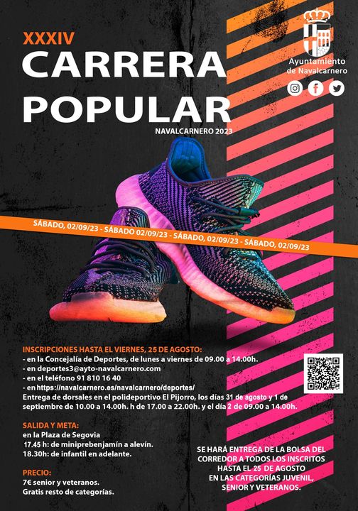 La inscripción podrá formalizarse hasta el próximo 25 de agosto en la concejalía de Deportes, mediante el correo electrónico deportes3@ayto-navalcarnero.com; a través del teléfono 91 810 16 40 y en la web https://navalcarnero.es/navalcarnero/deportes. Es gratuita para todas las categorías, salvo senior y veteranos, para las que tiene un coste de 7 euros.