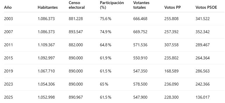 Sin embargo, antes de continuar con la lectura, es importante hacer un pequeño análisis de la historia electoral que precede a los comicios que se vivieron ayer. Remontándonos al año 2003, por no irnos a épocas que ya van quedando demasiado atrás, se puede hacer la siguiente tabla comparativa (con una pequeña ayuda de nuestra 'chati' para colocar datos):