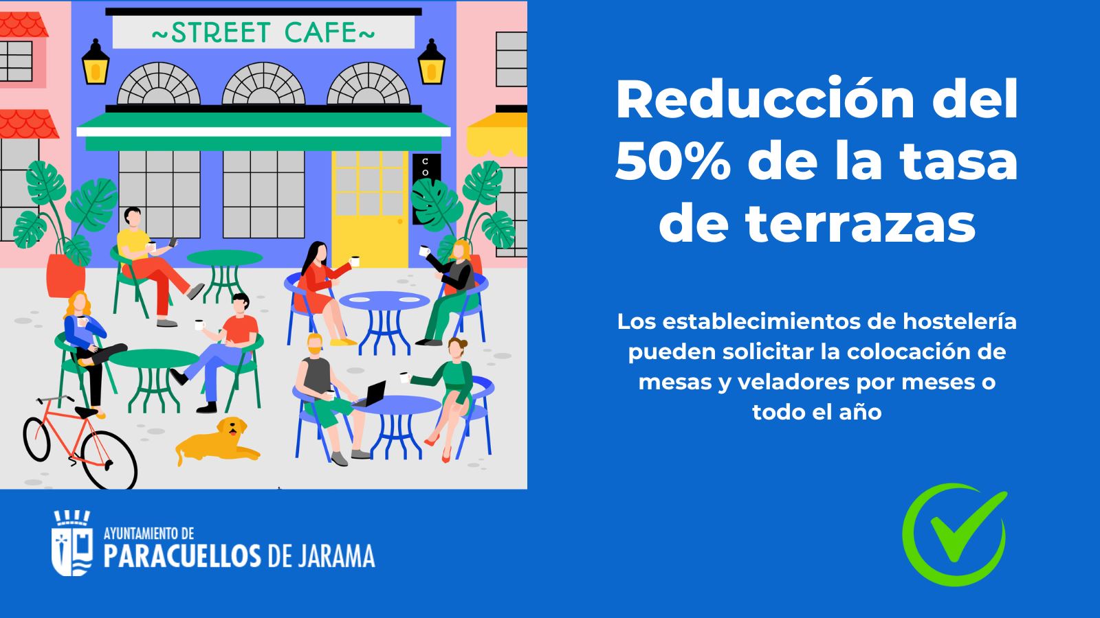 Desde la Concejalía de Industria y Comercio Local se ha impulsado la reducción en un 50% de la tasa de terrazas. La reducción está basada en el cambio normativo llevado a cabo en 2022, correspondiente a la aprobación de la Ordenanza municipal reguladora de terrazas, quioscos y similares en Paracuellos de Jarama (BOCM 6/10/2022) mediante la cual se ofrecía la posibilidad de instalar las terrazas durante todo el año.