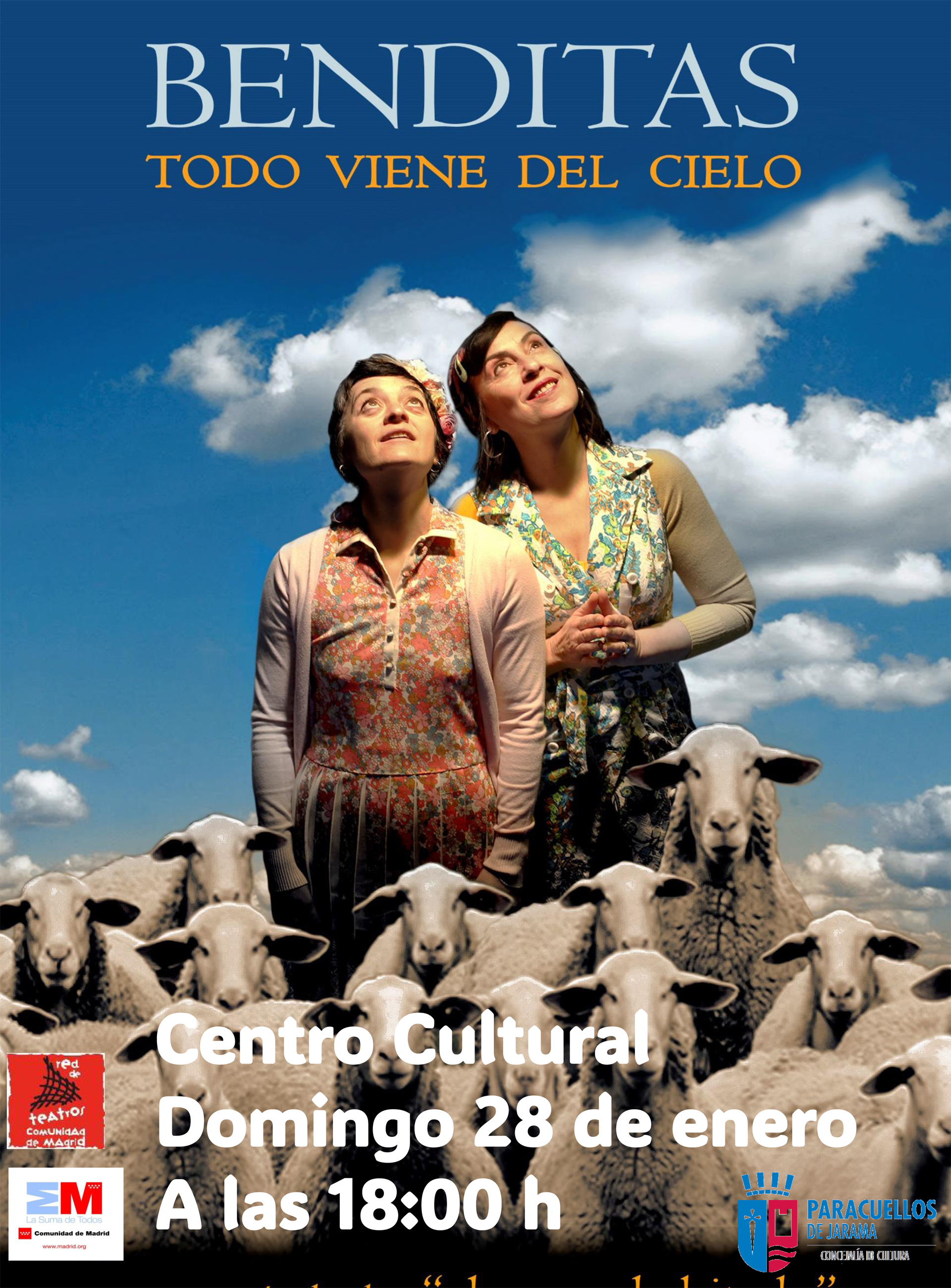 La Concejalía de Cultura del Ayuntamiento de Paracuellos de Jarama y la Red de Teatros de la Comunidad de Madrid ofrecen, el domingo 28 de enero, la obra de teatro ‘Benditas, todo viene del cielo’, recomendada a partir de 11 años.
