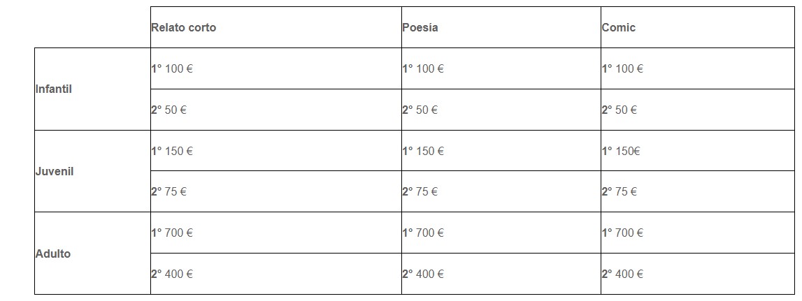 El premio literario constaba de esas tres modalidades, cada una de ellas dividida a su vez en tres categorías: infantil (menores de 12 años), juvenil (de 12 a 18 años sin cumplir) y adultos (desde 18 años).