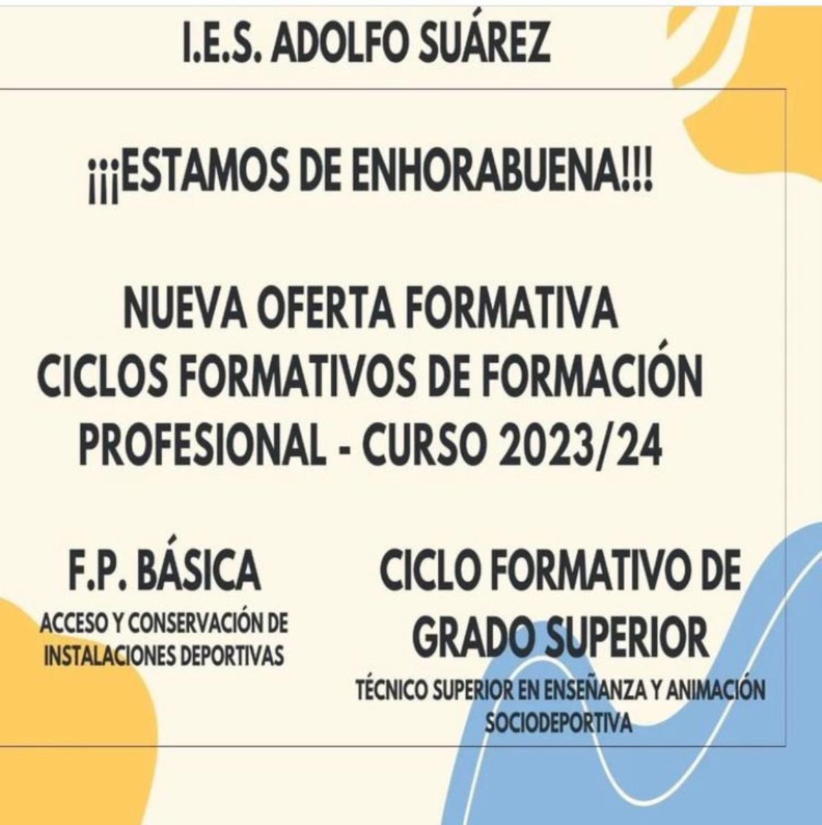 La concejalía de Educación del Ayuntamiento de Paracuellos de Jarama informa que el IES Adolfo Suárez contará, el próximo curso, con dos ciclos de Formación Profesional (FP): ‘Acceso y conservación de instalaciones deportivas’ de FP Básica, y el grado ‘Técnico superior en enseñanza y animación sociodeportiva’.