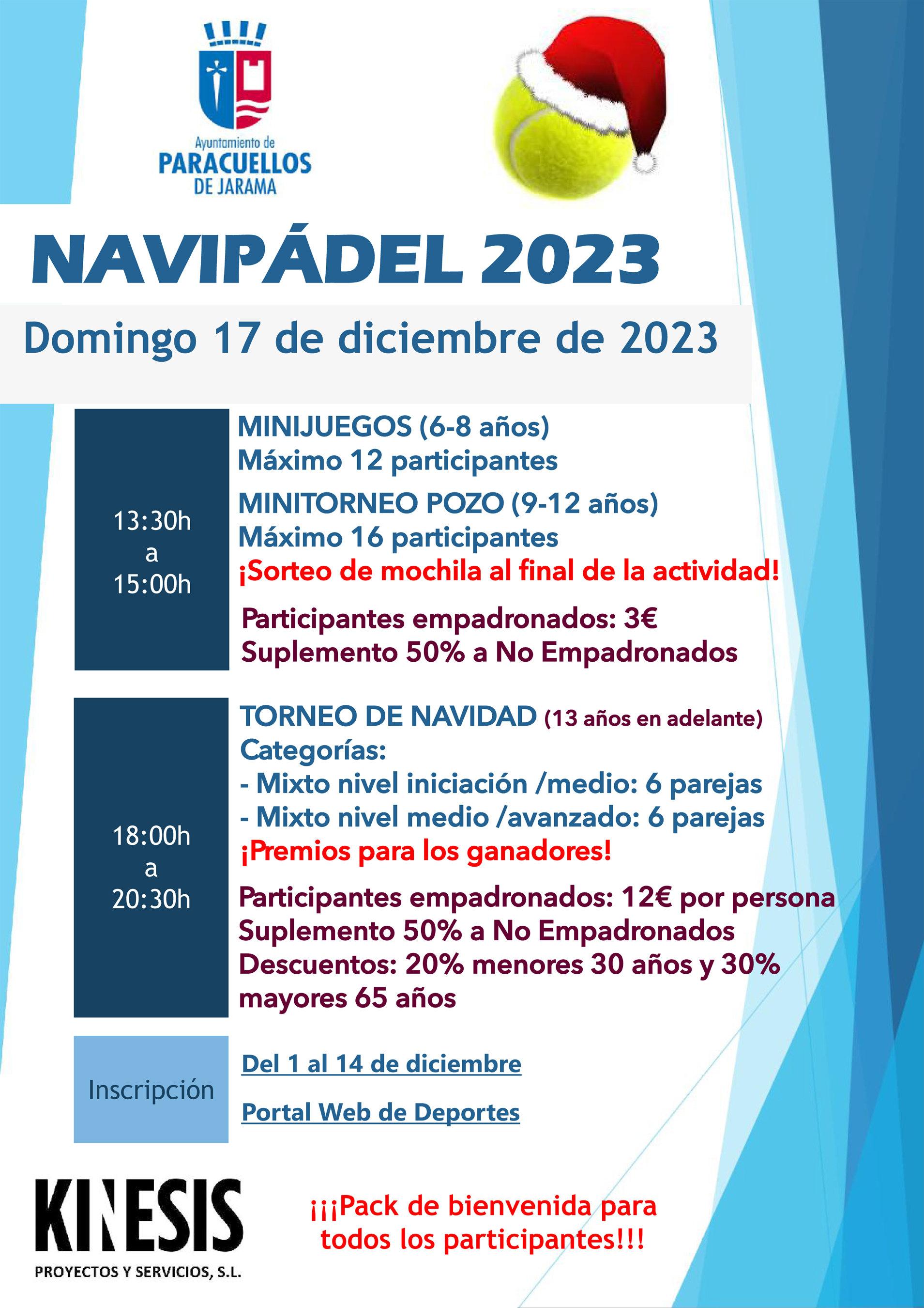 La Concejalía de Deportes del Ayuntamiento de Paracuellos de Jarama, en colaboración con la empresa Kinesis, ha organizado un torneo navideño de pádel que se disputará el próximo 17 de diciembre, desde las 18:00 horas, en las pistas del Polideportivo Municipal.