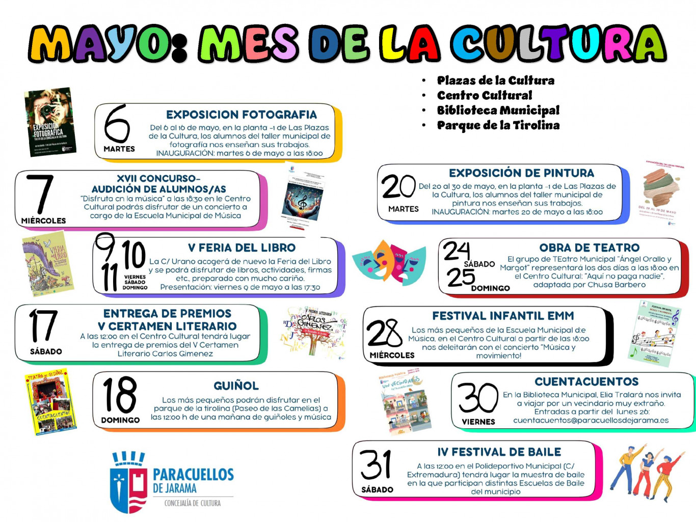 La Concejalía de Cultura del Ayuntamiento de Paracuellos de Jarama ha preparado una extensa y variada programación para ‘Mayo: mes de la cultura’. Estará compuesta por las siguientes propuestas: