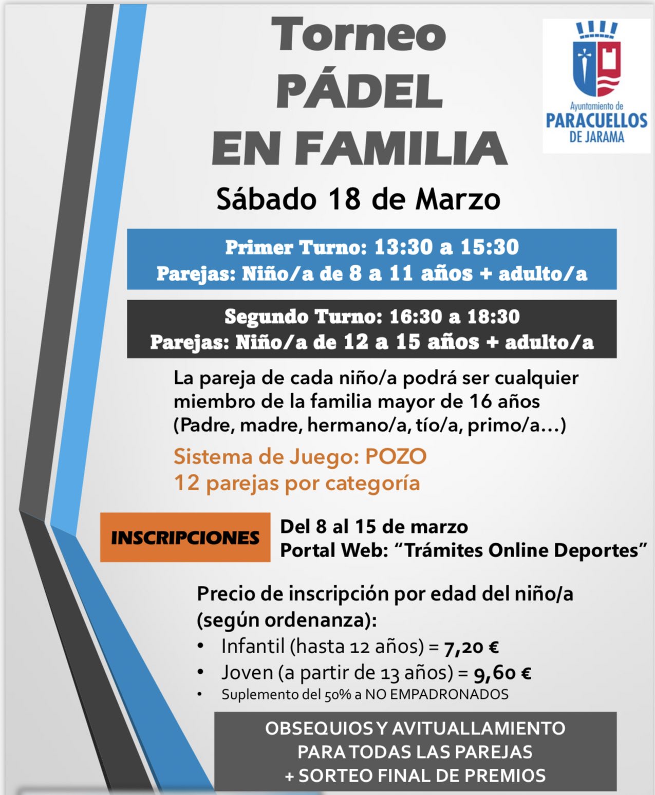 El Ayuntamiento de Paracuellos de Jarama y el Grupo Ánimas han organizado el ‘Torneo de pádel en familia’, que se disputará el sábado 18 de marzo de 2023, en las pistas del Polideportivo Municipal.
