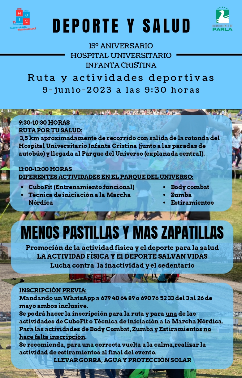 El próximo 9 de junio de 2023, el Ayuntamiento de Parla, a través de la Concejalía de Deportes y en colaboración con el Hospital Universitario Infanta Cristina, ha preparado diversas actividades deportivas con motivo del 15º aniversario desde la apertura del hospital en el municipio. Los plazos de inscripción comprende desde el 3 al 26 de mayo, ambos incluidos.