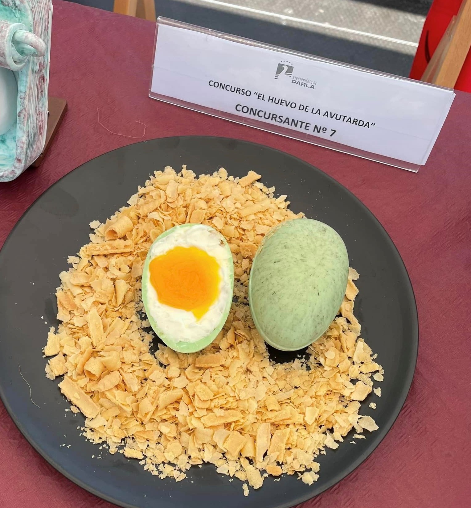 El parleño Huevo de Avutarda es un dulce con forma de huevo. Su cáscara es de chocolate blanco, coloreada de un verde azulado, como los huevos reales del ave. En su interior un bizcocho de cerveza -que recuerda al autor a los campos de trigo y cebada de su infancia-, relleno a su vez de mousse de queso -homenaje a las vaquerías que hasta hace pocas décadas había en el centro de la ciudad- y yema tostada -en recuerdo a las gallinas con las que se cruzaba por "los corralones"-.